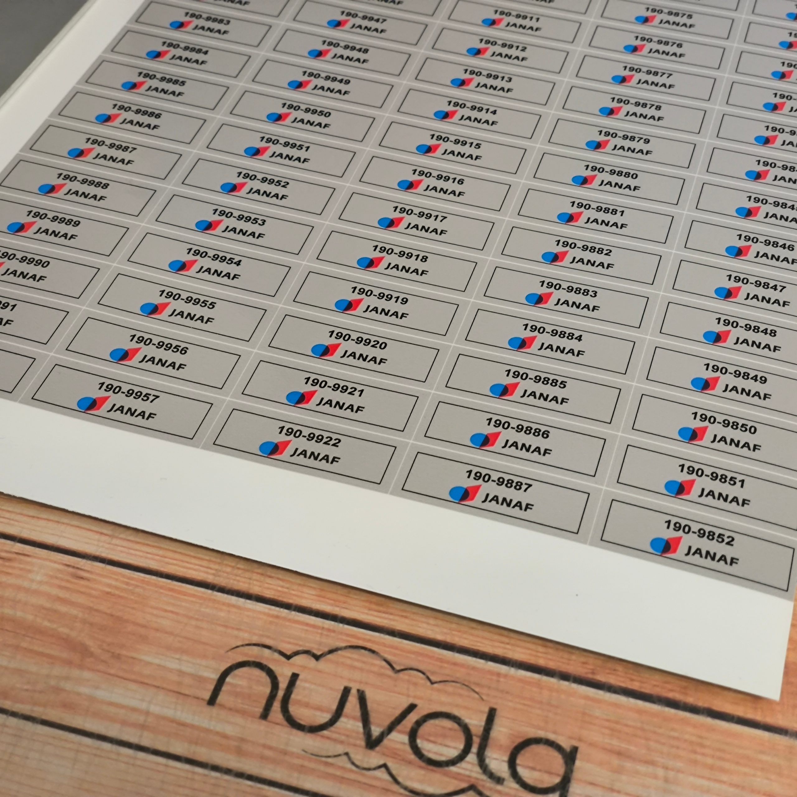 PVC samoljepljive naljepnice tiskamo na kvalitetnu samoljepljivu foliju renomiranih proizvođača (Orafol, 3M ili Politape), tintama koje su ekološki prihvatljive i otporne na vlagu i UV zrake. Naljepnice dolaze u arcima, s otisnutim brojem i dodatno zaštitnom laminacijom.