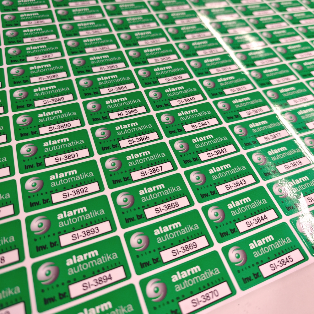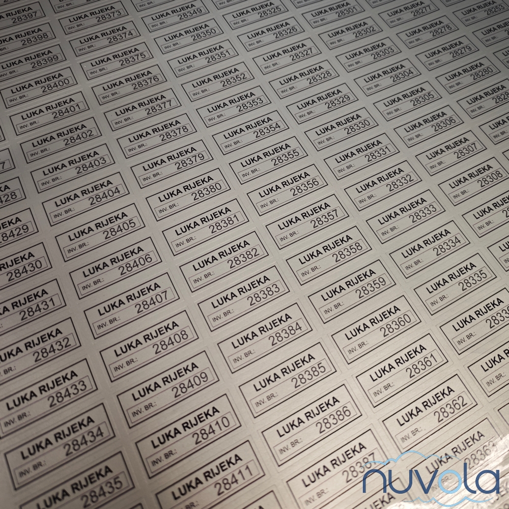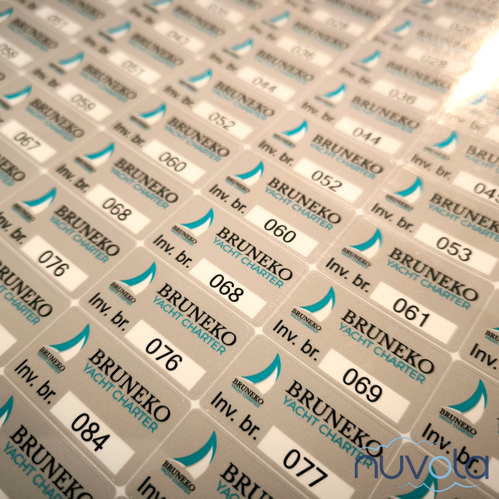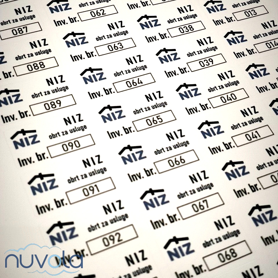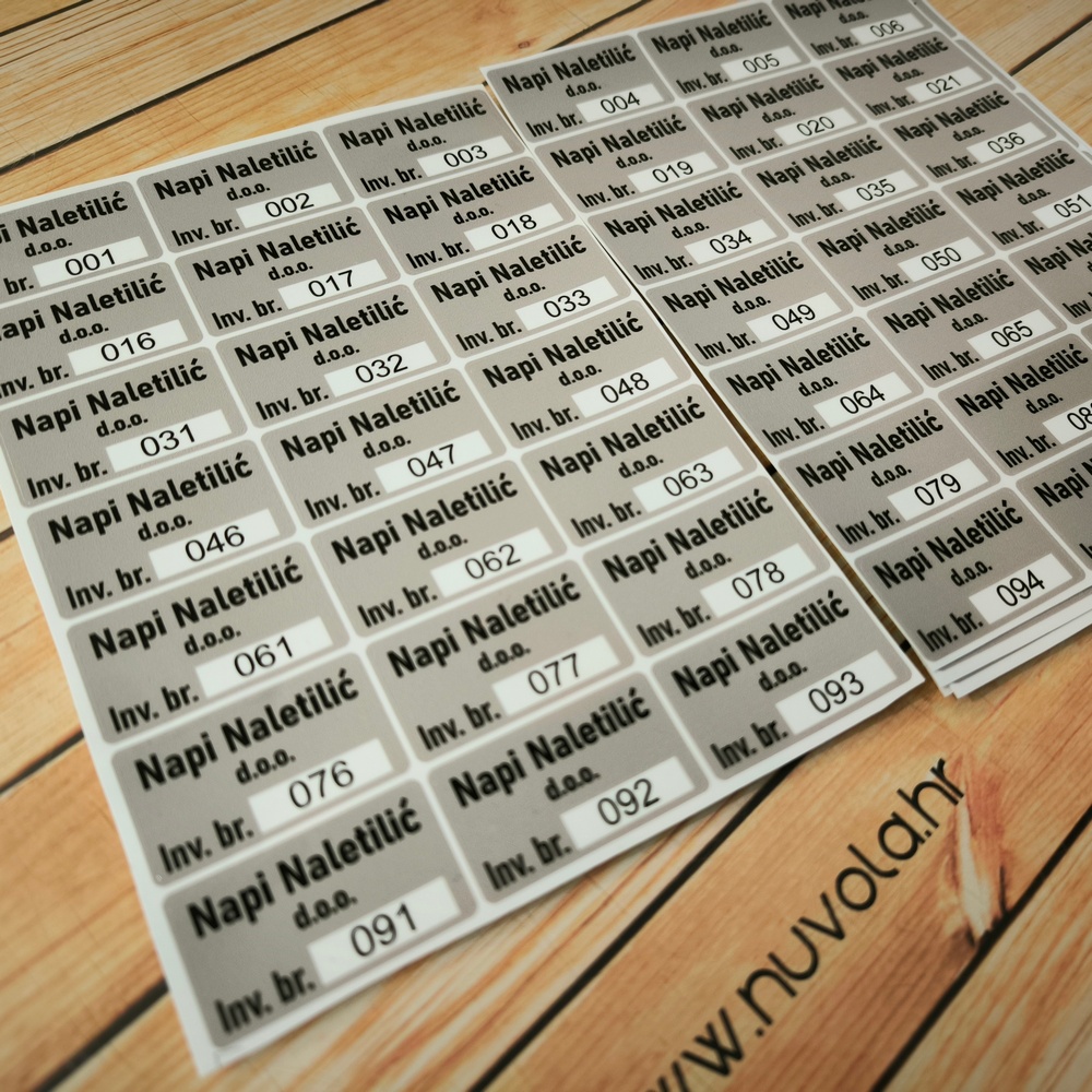 Inventarne brojeve možemo izraditi i u bilo kojoj drugoj dimenziji te dodati Vaš logotip. Obavezan podatak osim naravno broja je naziv tvrtke, obrta, udruge isl…